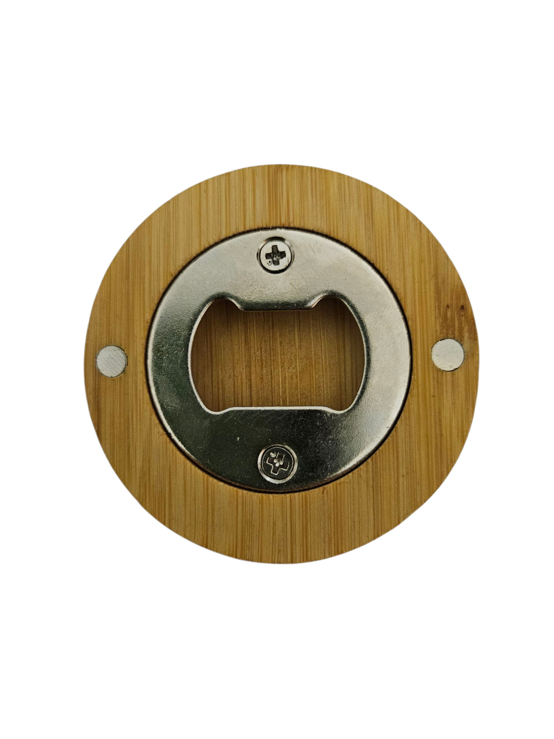 Stevige, ronde flesopener van beukenhout. Ook te gebruiken als onderzetter. 2 magneten op de achterzijde.